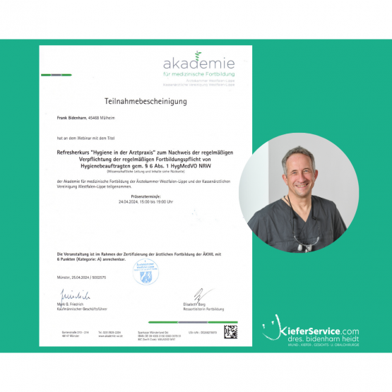Zum Nachweis der regelmäßigen Verpflichtung der regelmäßigen Fortbildung von Hygienebeauftragten gem. § 6 Abs. 1 HygMedVO NRW, nahm unser Dr. Frank Bidenharn am Refreshkurs erfolgreich teil.