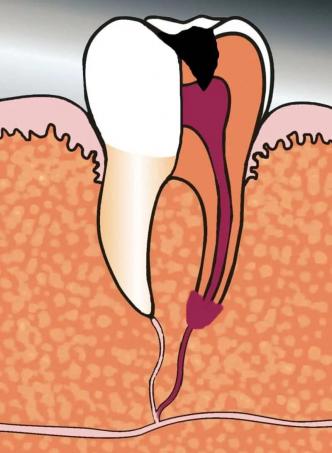 Das Zahnmark kann auch langsam absterben (Nekrose). Diese Entwicklung erfolgt schleichend und ist meist nicht mit Schmerzen verbunden. Auch hier kommt es später zur Auflösung des Knochens um die Wurzelspitze.