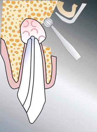 Nach Mobilisierung der Schleimhaut werden die Wurzelspitzen dargestellt und mit dem entzündlichen Gewebe entfernt. Mit Anfärbung der Schnittfläche werden eventuell weitere versteckte Wurzelkanäle dargestellt.